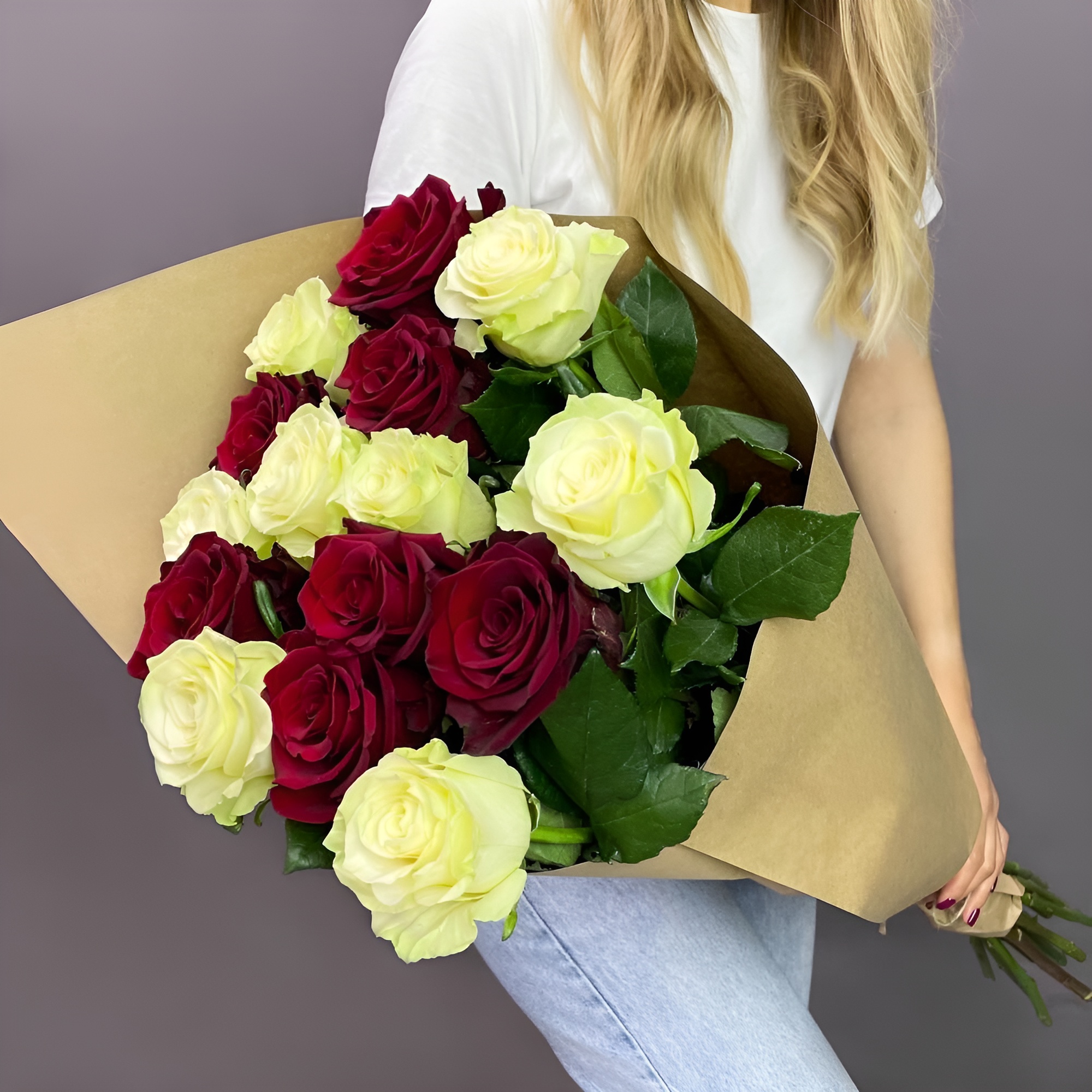 Уникальная композиция из красных и белых роз — воплощение гармонии противоположностей. Идеальный выбор для влюбленных, юбилеев или особых признаний. Купить букет роз Еманжелинск.