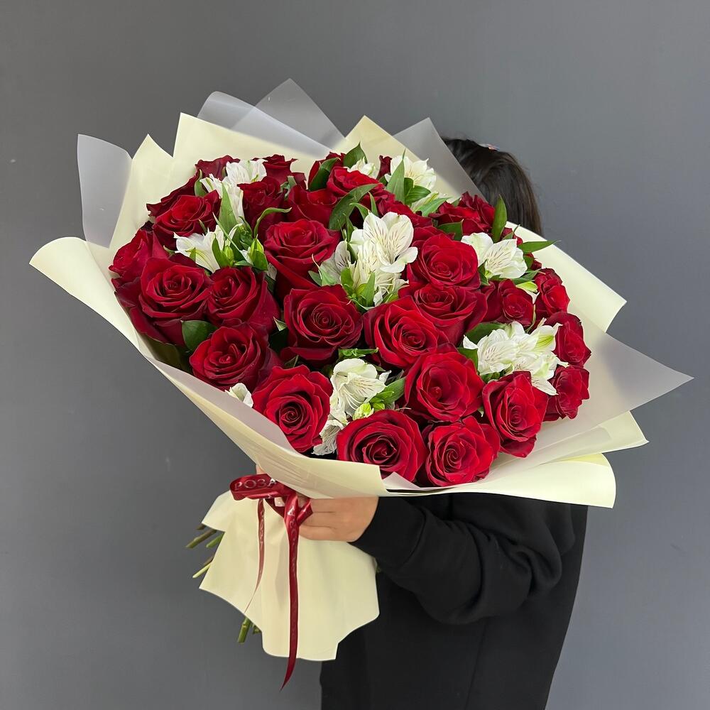 Волнующая композиция из алых роз и белоснежных альстромерий — воплощение совершенной любви. Идеальный выбор для романтического признания или годовщины отношений. Заказать букет цветов с доставкой в Еманжелинске.
