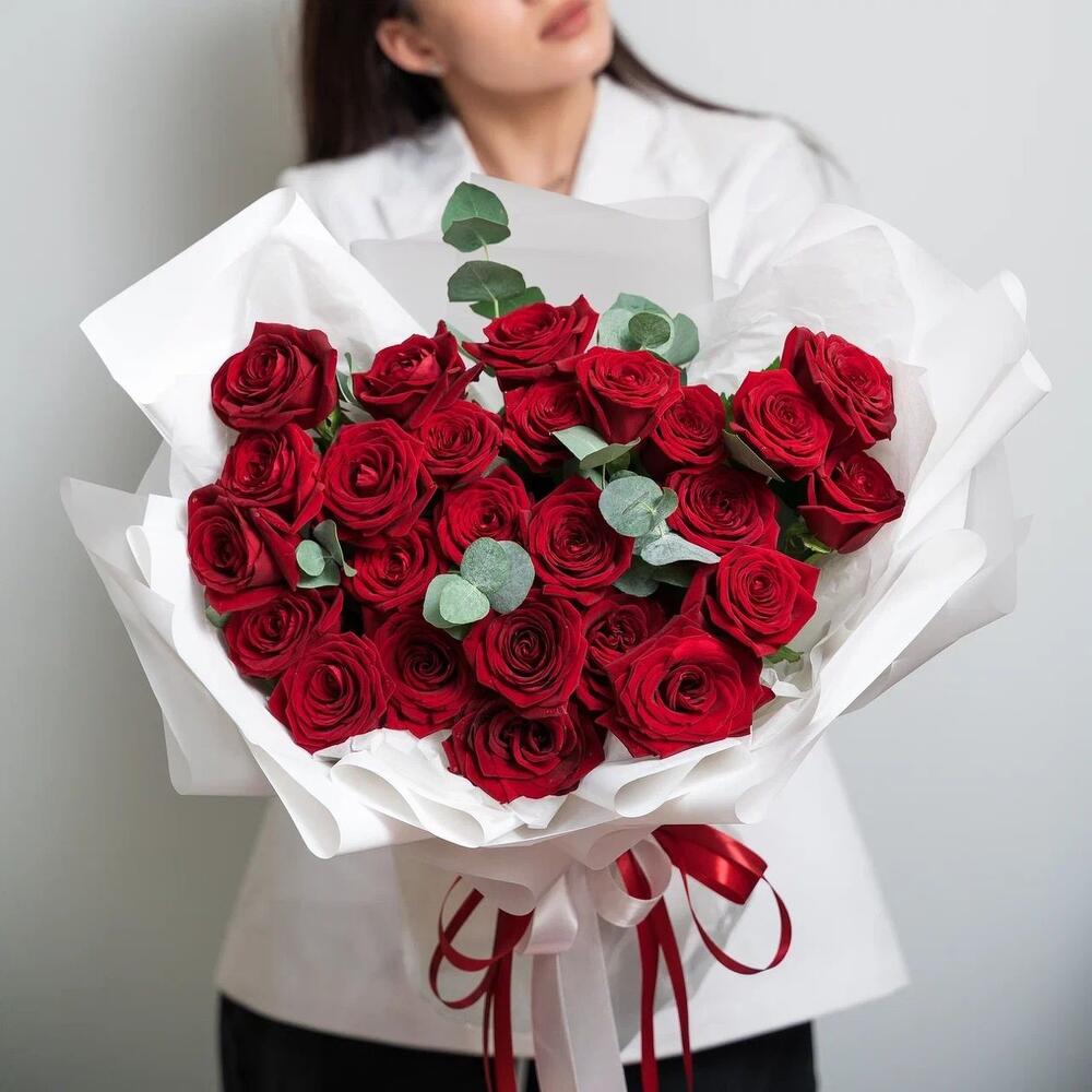 Роскошный букет из 25 красных роз с эвкалиптом – королевский подарок