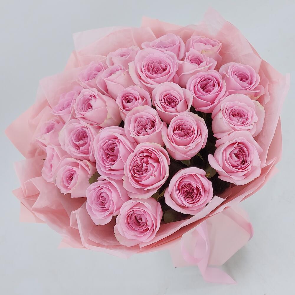 Роскошный букет из 25 нежно-розовых роз на длинных стеблях (60 см) — воплощение изысканности и хорошего вкуса.