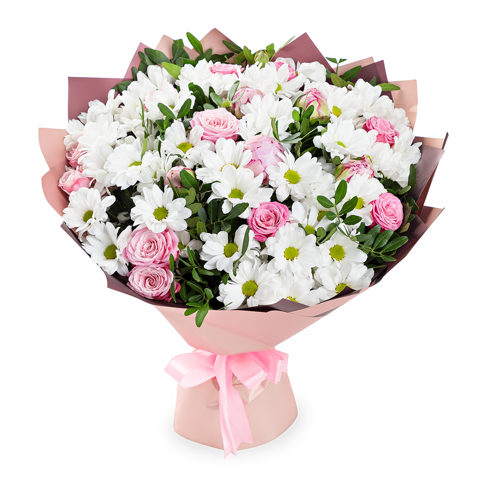 Изысканный букет сочетает нежно-розовые розы и пышную белую хризантему, создавая гармонию романтики и чистоты. Эта свежая композиция идеально подходит для признания в чувствах или особого поздравления. Купить букет цветов в Еманжелинске.