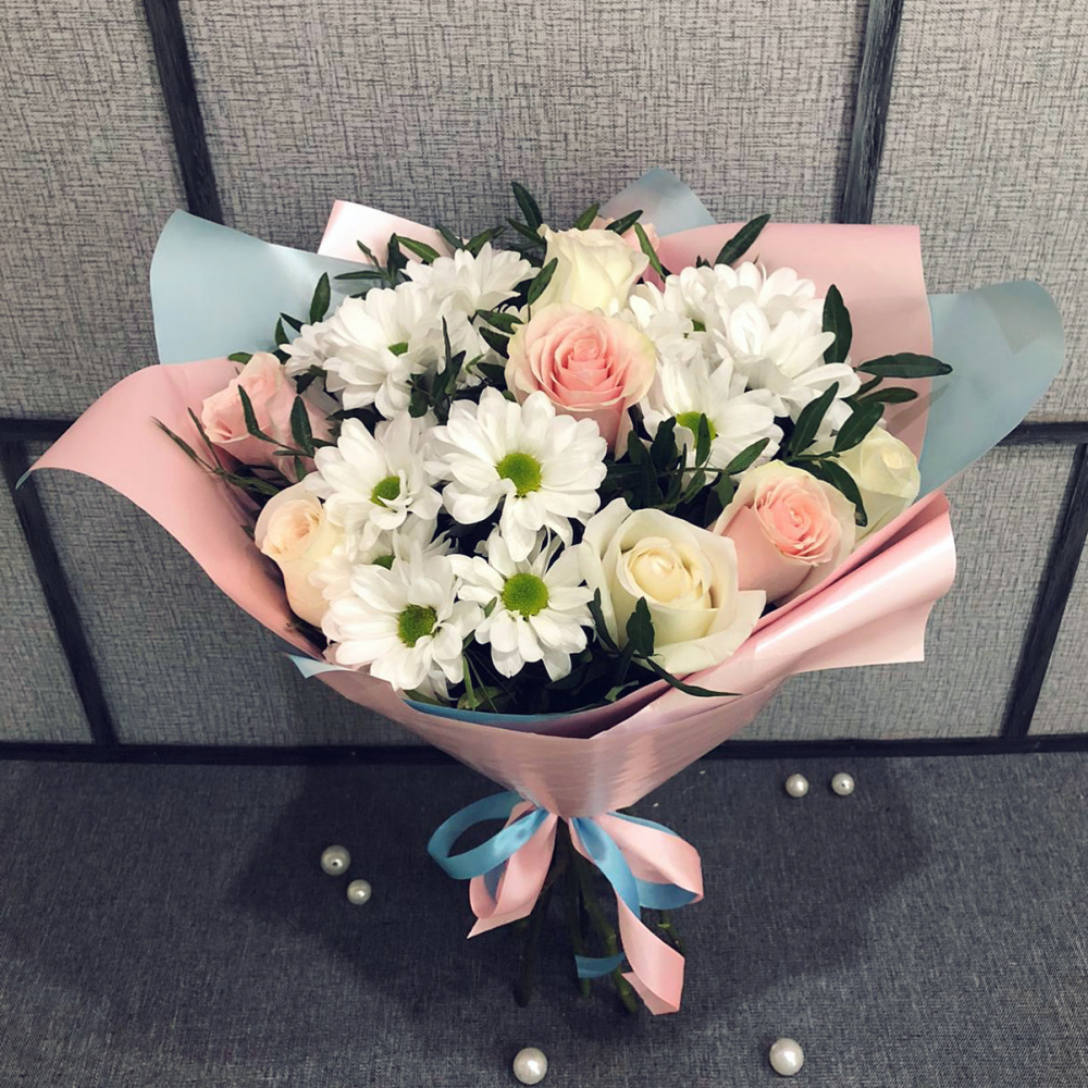 Букет из свежих роз и белых хризантем – гармония нежности и чистоты