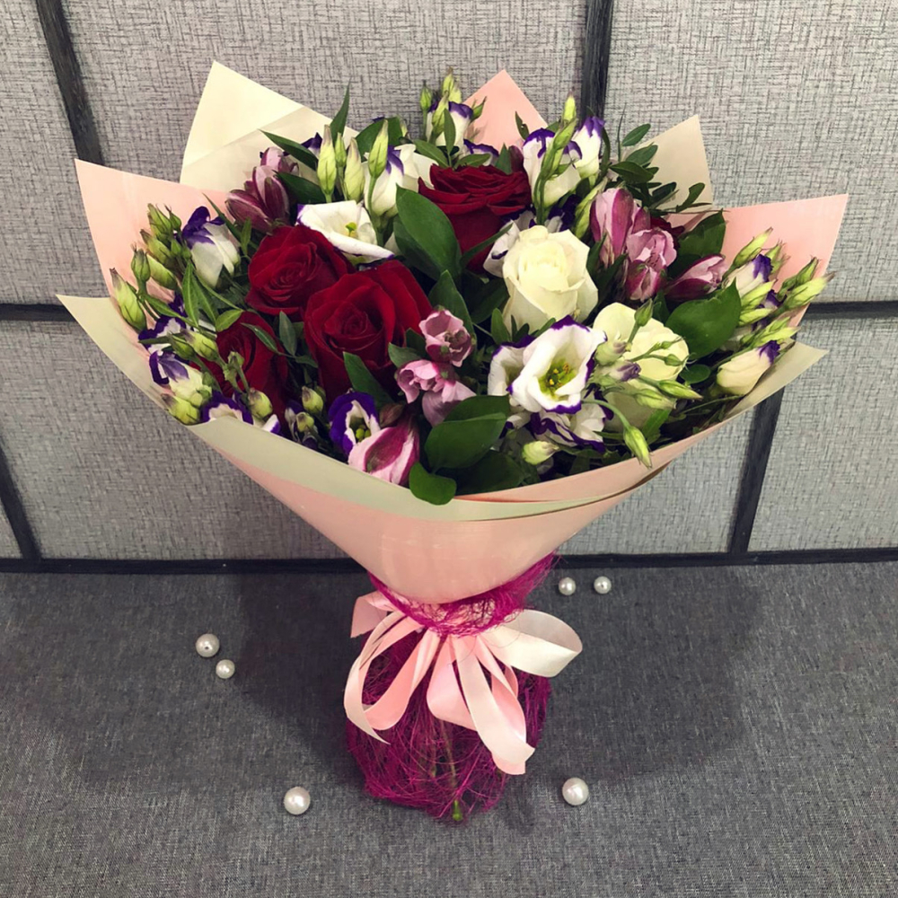 Изысканная композиция из роз, эустом и альстромерий – идеальное сочетание нежности и долговечности. Прекрасный выбор для романтических моментов и торжеств. Заказать букет цветов с доставкой в Еманжелинске.