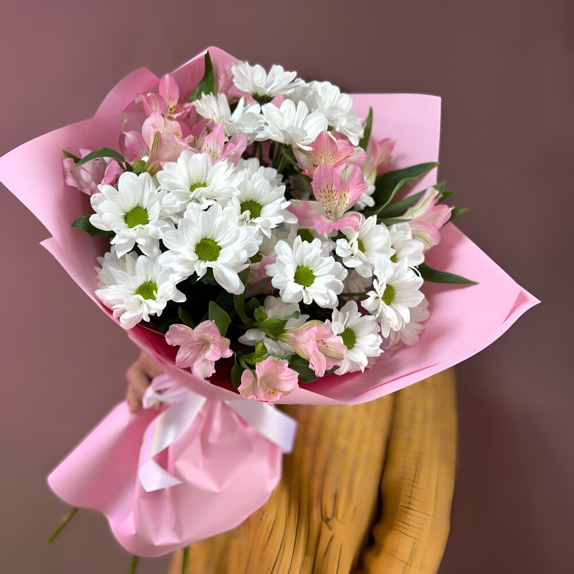 Воздушный букет «Поцелуй бабочки» сочетает белоснежные хризантемы и нежно-розовые альстромерии, создавая образ лёгкости и трепетной красоты.