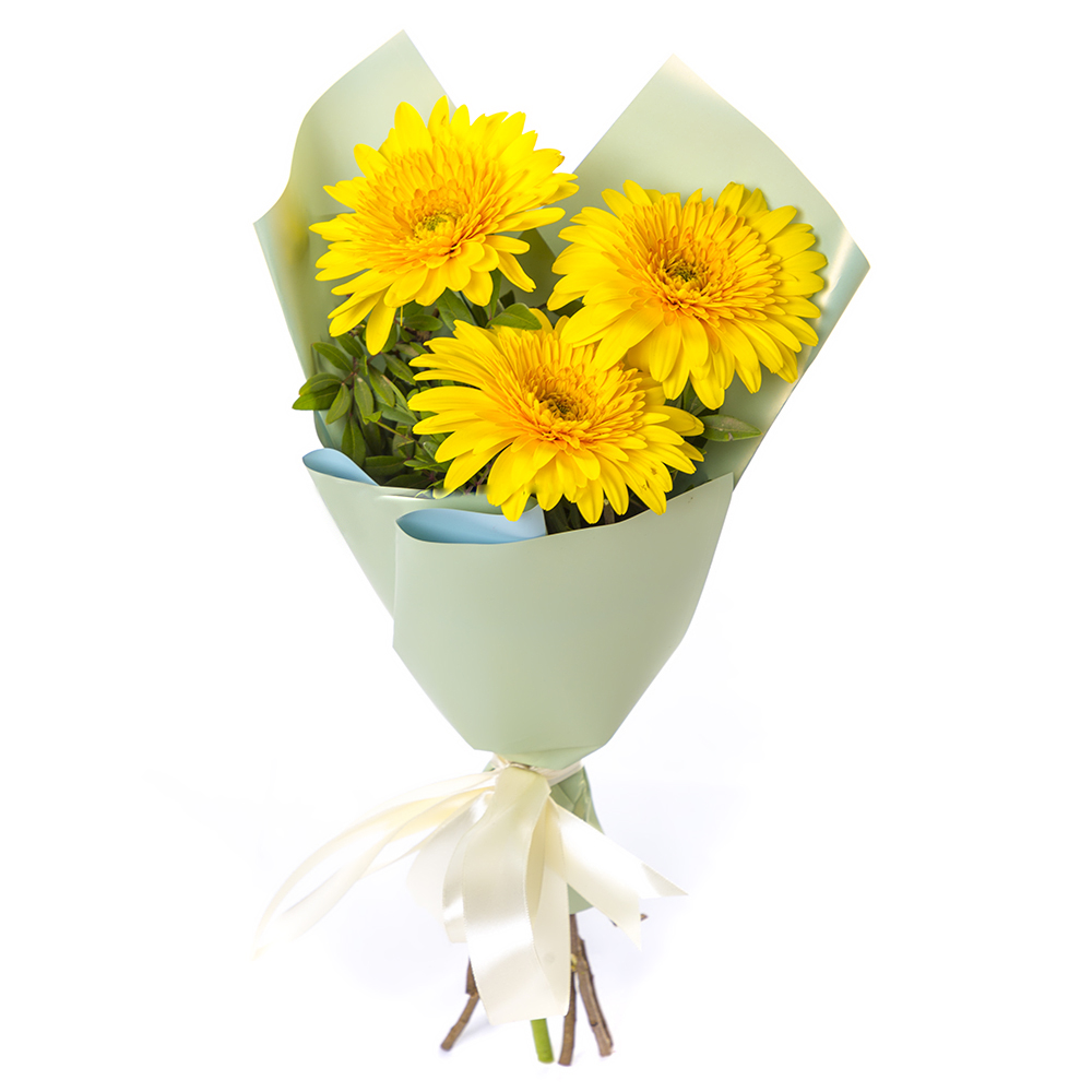 Яркий букет из 3 жёлтых гербер – частичка солнечного света