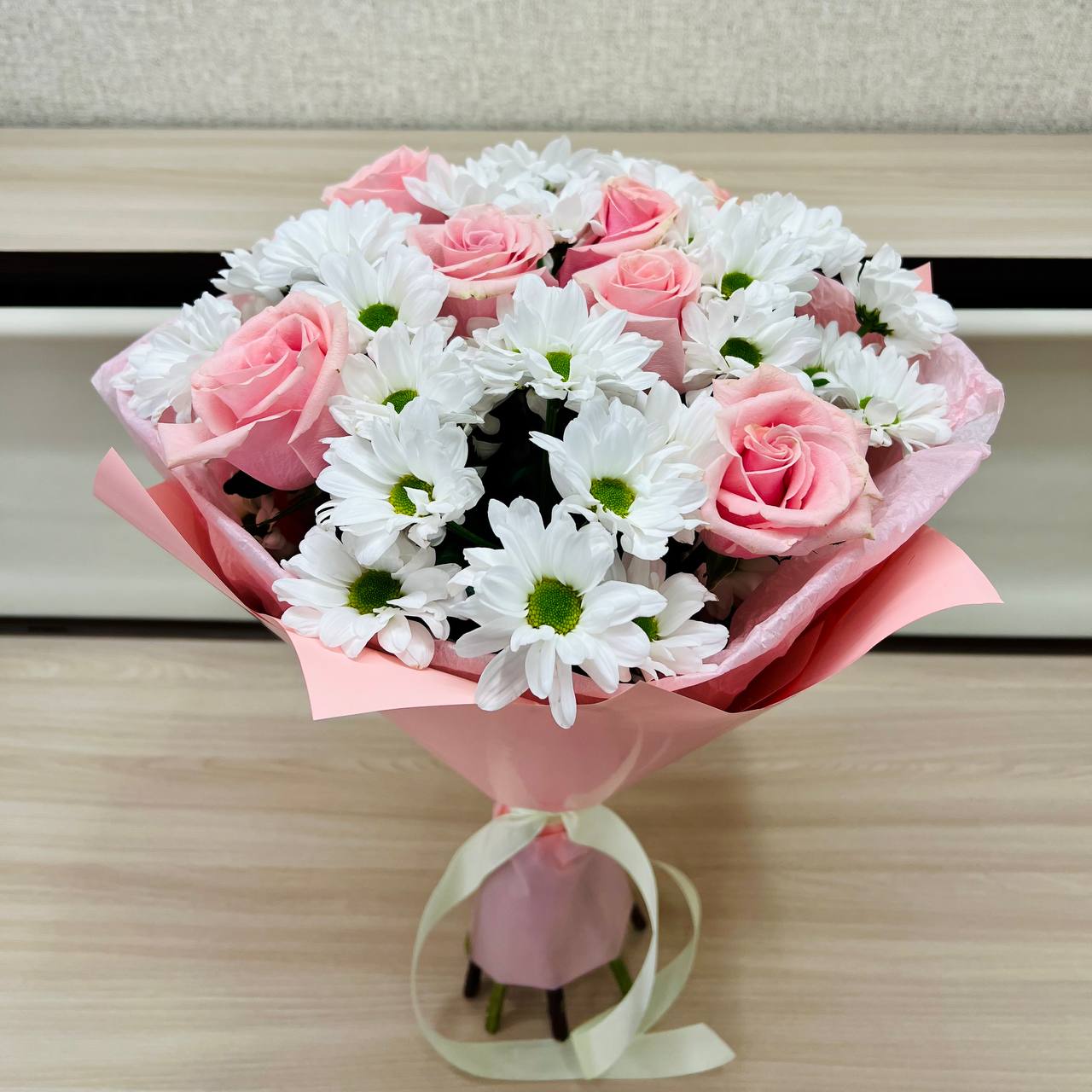 Букет «Розовый поцелуй» – нежность розовых роз и чистых хризантем