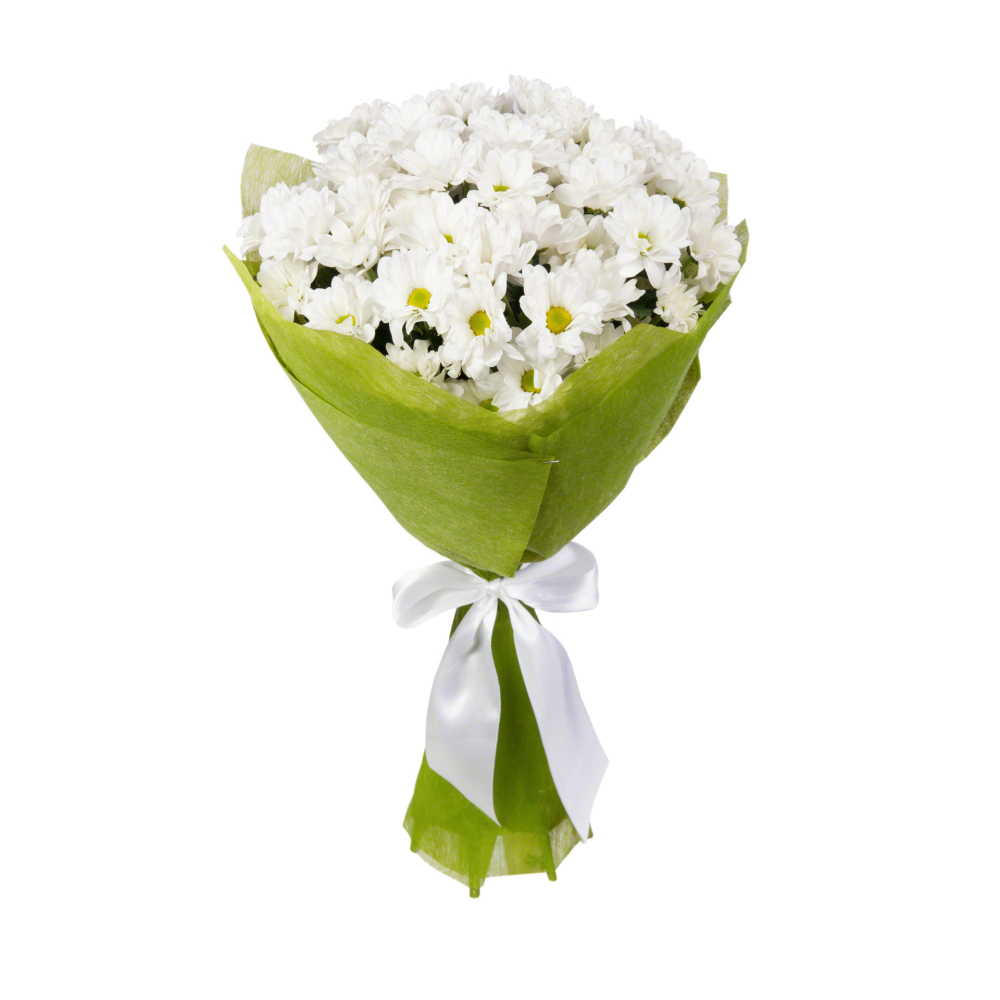 Роскошный букет из свежих хризантем в стильной фетровой упаковке — воплощение утонченного вкуса.