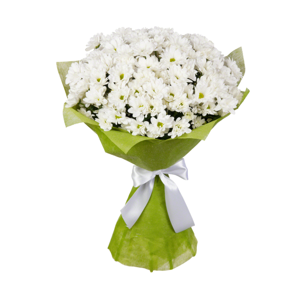 Роскошный букет из свежих хризантем в стильной фетровой упаковке — воплощение утонченного вкуса.