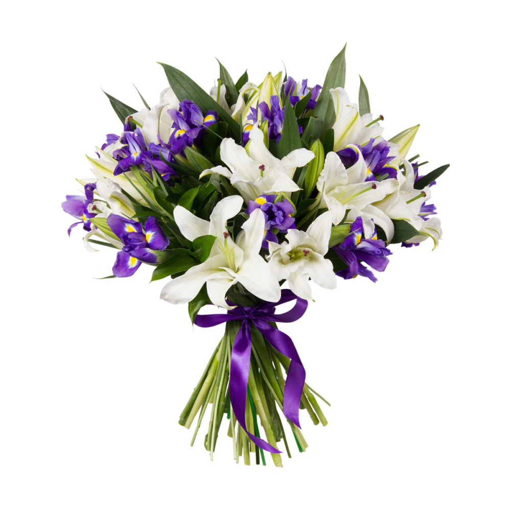 Букет Средний из белых лилий и голубых ирисов – гармония нежности и легкости