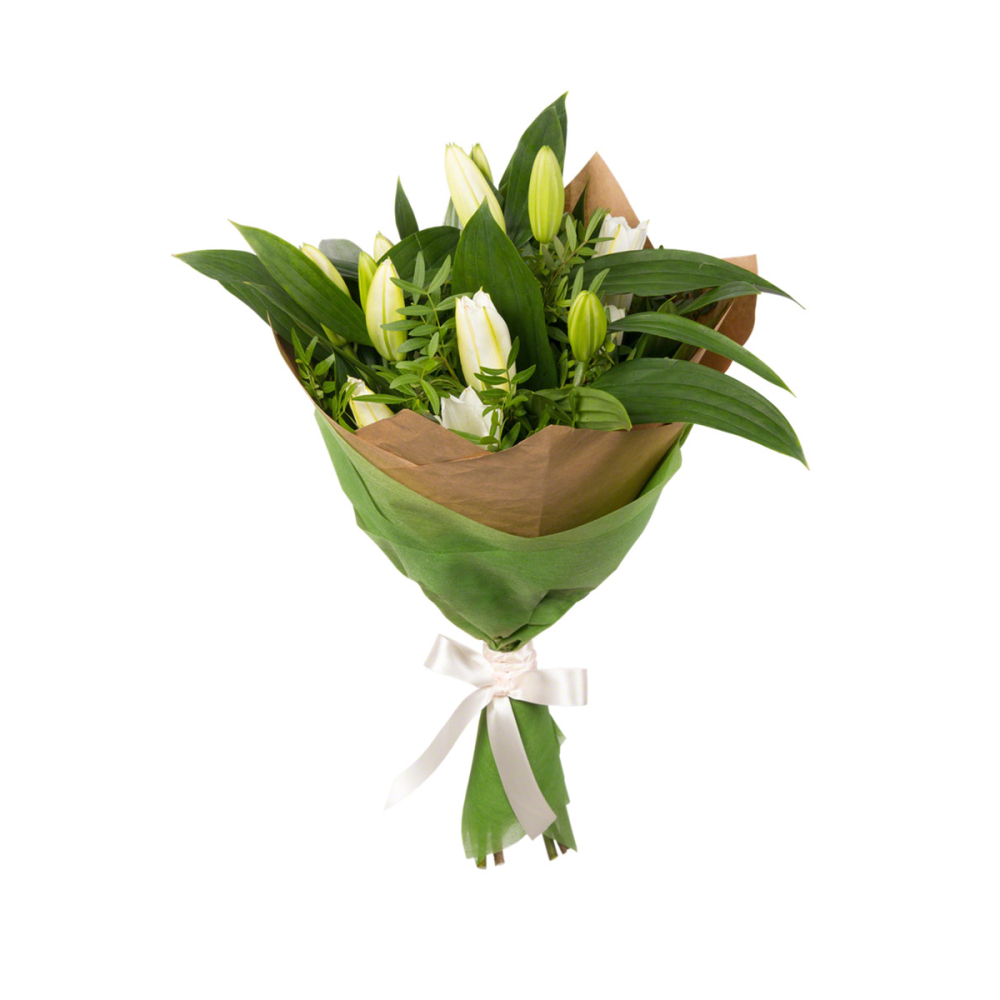 Утонченный букет из белых лилий с нежной фисташковой зеленью — воплощение свежести и изысканности. Идеальный выбор для романтического жеста или знака внимания. Букет цветов с доставкой Еманжелинск.